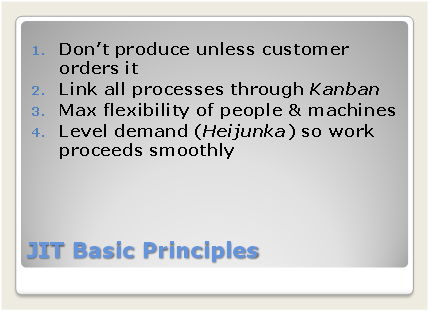 Companies often shy away from JIT Production because it involves eliminating the “safety net” of buffers and WIP and finished goods inventory. And that can be scary. But it doesn’t have to be done in one fell swoop. We can manage the risk by planning and executing a gradual reduction in inventories as our processes are improved and become more reliable… and our employees become more trained in lean. If our finished goods inventory is two weeks, we can work as a team to plan a reduction to one week. We stabilize the process, and agree on when to move it down to four days, then two days, etc., until we are eventually producing exactly what the customer needs exactly when he needs it, and no more.