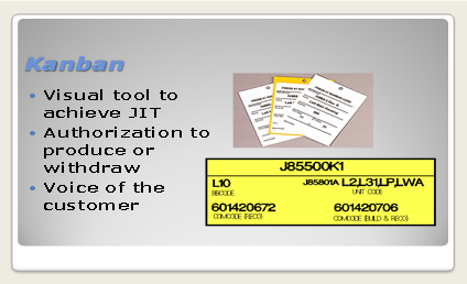 JIT uses a simple mechanism called kanbans to communicate what needs to be pulled through the system. Kanbans connect and synchronize all the sub-processes in the JIT process.
